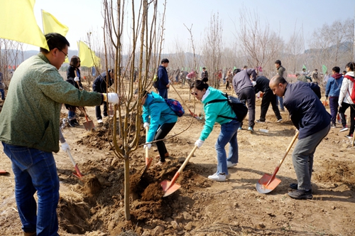 中科院绿化办介绍了活动安排及注意事项,怀柔区绿化委工程师为大家讲解了植树技术要点及栽种流程。各单位领取树苗和工具后,三五一组开始忙碌起来。植树过程中,有的用力挥锹铲土,有的将幼苗入坑,细心扶正苗木,再用力培实新土压实,栽好一棵后,再栽另一棵,每一道工序都做得一丝不苟。大家动作熟练、配合默契,繁忙而有序,干得热火朝天。一上午功夫,300株树苗“安家落户”,其中有山桃、西府海棠、侧柏、油松等十余种。